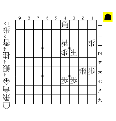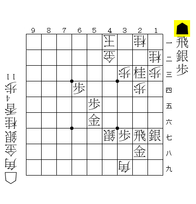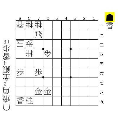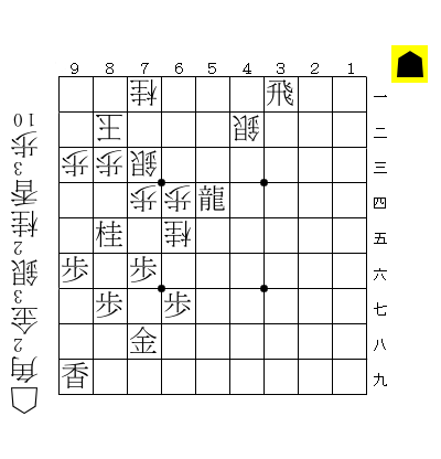 初期配置で、☖9三玉と☖7三玉の上部脱出は☗8五桂がしっかりと抑え込んでいます。