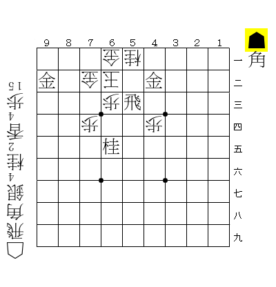 ☗2六銀打☖同玉☗1八桂打☖2七玉☗2八金打☖3六玉☗3七金☖2五玉☗2六金☖2四玉☗3五角☖同歩☗4四龍☖3四桂打☗2五香打 15手詰