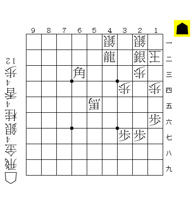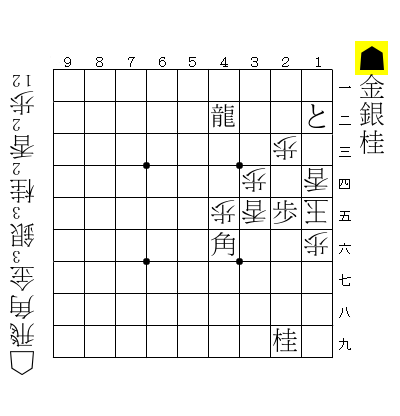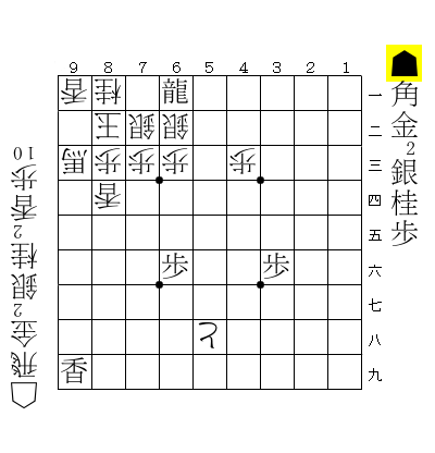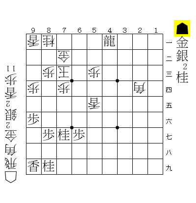 >☗9四桂☖同香☗9一角打☖9二玉☗8一角打☖9一玉☗9二銀打☖8二玉☗7一龍☖同玉☗7二金打 11手詰