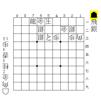 ☗5三角成☖3三玉☗3二銀成☖2四玉☗2五金打☖同玉☗3七桂☖1六玉☗1七金打☖1五玉☗2六金☖2四玉☗2五金☖1三玉☗3一馬 15手詰