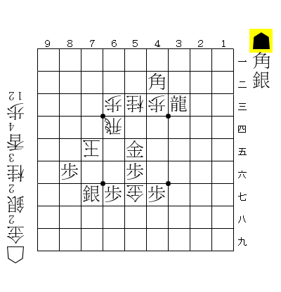 3五銀打、同香、1四金打、同玉、2三銀打、1五玉、1四金打、同飛、同銀成、同玉、1三飛打、2四玉、2三金、3四玉、3三金、4四玉、3四金、同玉、3三飛成 19手詰
