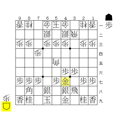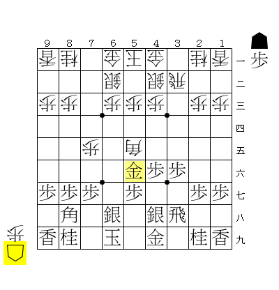 棒金みたいに金を繰り出してみたケド、金はタテヨコに動ける(利く)駒なので、前衛にだしても取られなければいいよね?(n*´ω`*n)つぎは後手番です♪☆( ˶’ᵕ’˶ )