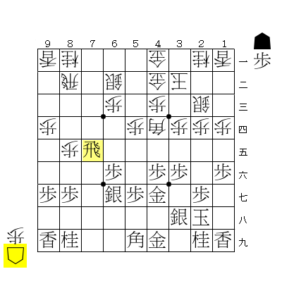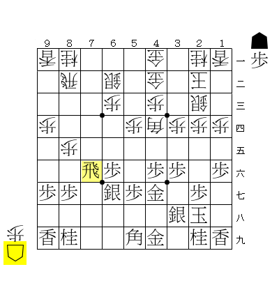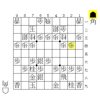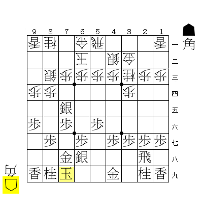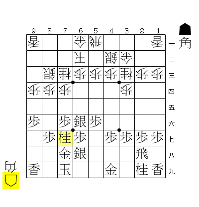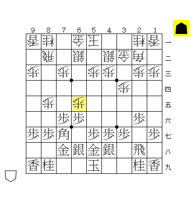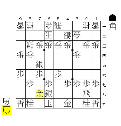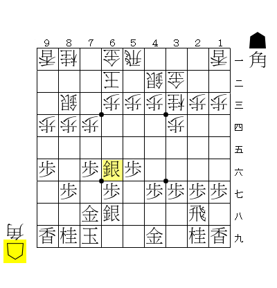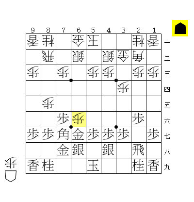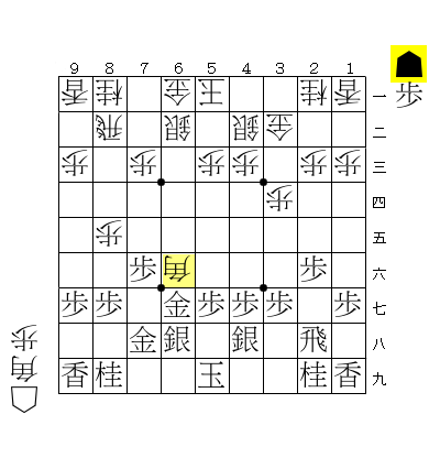 ☖9五角、☗7七角、☖6七歩、☗6七同金引として、