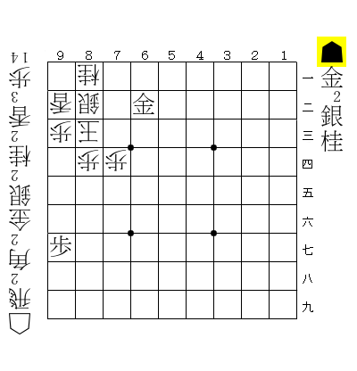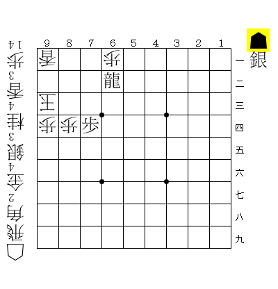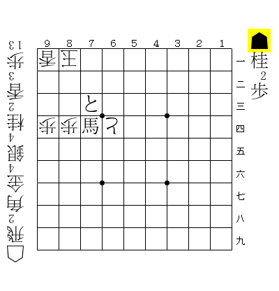 ☗7二銀打☖9四玉☗9五金打☖同玉☗9六金打☖9四玉☗8六桂打 7手詰