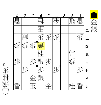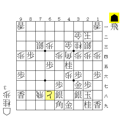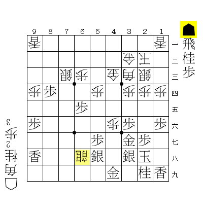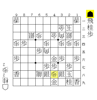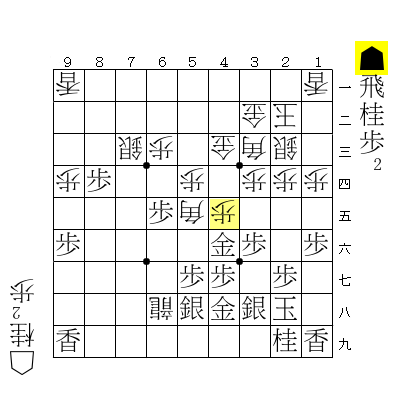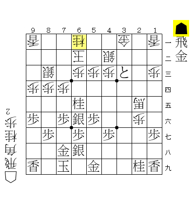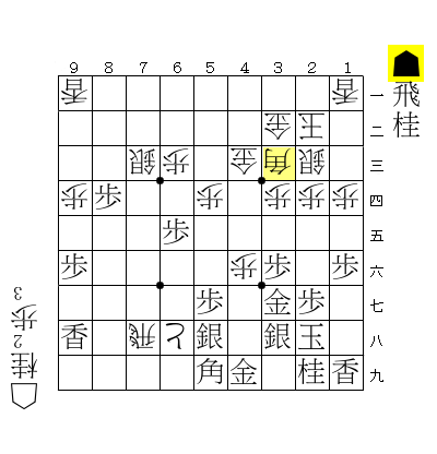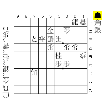 ☗2三桂成☖同玉☗2二飛打☖3三玉☗2四銀打☖4三玉☗4二飛成 7手詰