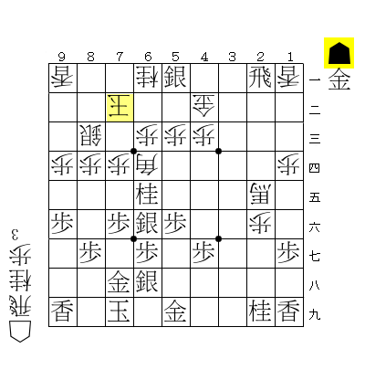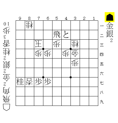 ☗6四香打☖6三桂打☗同香成☖同銀☗同角成☖同玉☗7四銀打☖5二玉☗6四桂打☖5一玉☗4二銀打☖同玉☗3三歩成☖5一玉☗4一飛打☖6二玉☗6三金打☖7一玉☗7二金 19手詰