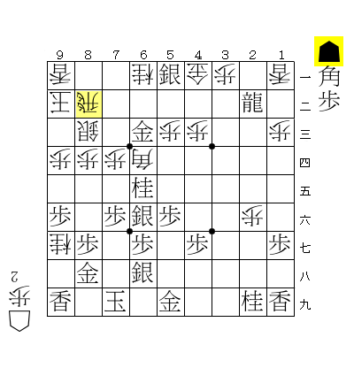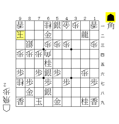 ☗1八歩打☖同玉☗1九銀打☖同玉☗3九龍☖1八玉☗2九角☖1九玉☗1八角☖同玉☗1九歩打☖1七玉☗3七龍☖1六玉☗2七龍☖1五玉☗2五龍 17手詰