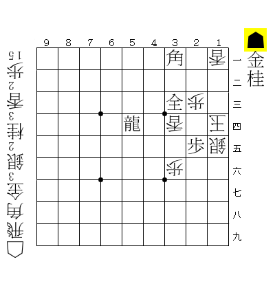 ☗2一銀打☖同玉☗3一桂成☖1二玉☗4五角☖3四歩打☗2四桂打☖同香☗3二飛成☖2二金打☗同龍☖同玉☗3二金打☖1二玉☗2二金打 15手詰