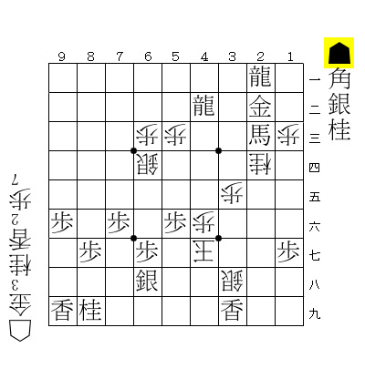 ☗7六桂打☖同歩☗7五金打☖同玉☗7四飛打☖同金☗9三角不成☖8六玉☗7六龍☖9五玉☗8七桂打☖同と☗9六歩打☖9四玉☗7四龍☖9三玉☗8四金打☖8二玉☗7一龍 19手詰